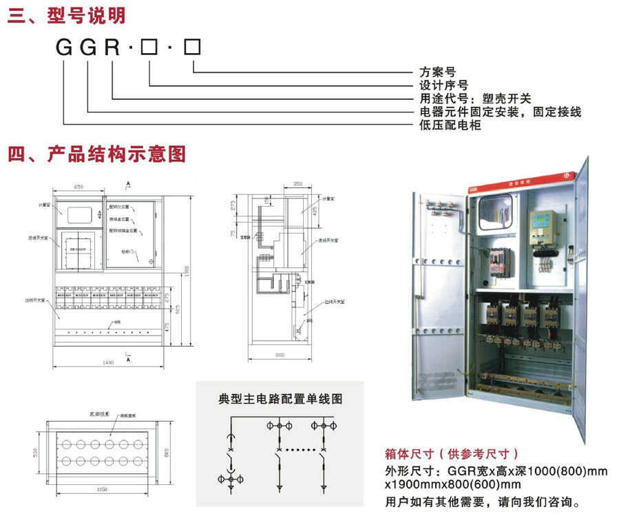 >產品GGR靠墻安裝正面維護,門板貼橡膠條,防護等級戶內達到30,戶外達到IP33;內部按主要元器件分成各功能室,計量室設計成一個外面無法拆裝的密封空間;正面預留足夠大的檢修門,方便后面器件檢修,出線