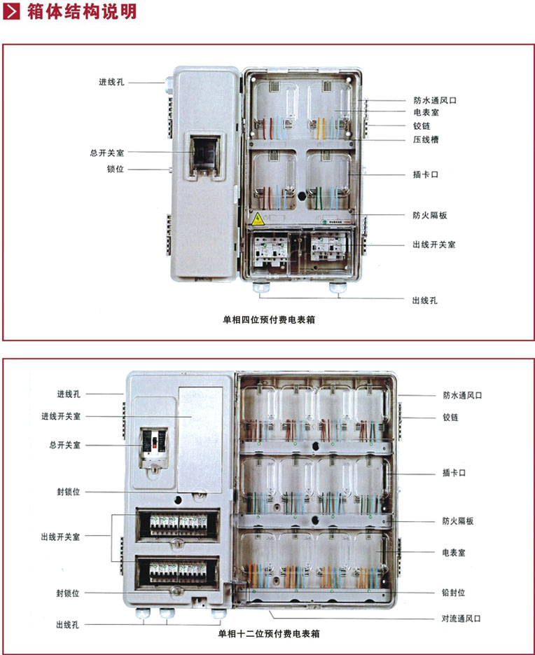 >為了便于管理,多表位單表箱內的開關、電能表采用了分別集中設計,整體上可分為開關箱和電能表箱兩個部分,在電能表箱兩個部分,在電能表箱可安裝電能表、采集終端等,開關室可安裝總開關,空氣開關或者隔音開關。電能表室和開關室均分別安裝設單獨開啟的門封鎖。這種設計主要是為了計量管理上的方便和操作